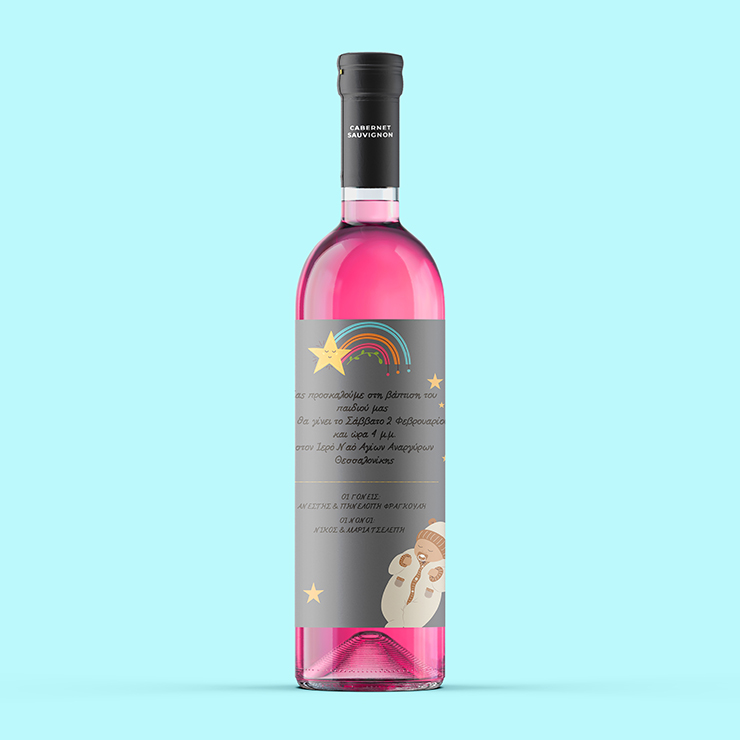 Μία αυτοκόλλητη ετικέτα που θα διακοσμήσει τα μπουκάλια των κρασιών σας προσαρμοσμένη στο θέμα της βάπτισής σας.